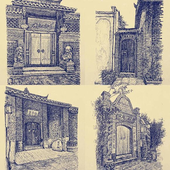 然,人、事、景、物均是历史车轮下的一粒粒尘埃,我们能做的除了活在当下还有记录。著名的钢笔画家、中美杰出华人艺术家半山先生,一直致力于还原古代建筑、探究历史真相、“画”录当代人文。“宽窄巷子”作为成都的标志之一,自是心向往之。一遍遍地游历,一次次地思考,终窥得其中之奥秘——门!