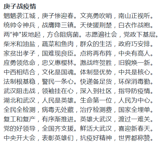 抗击新冠肺炎诗歌 此时此刻全国各地,火速驰援而至。一队又一队,前线人员逆行者,奔赴武汉坚守阵地。兵贵神速,如雷霆战机,抗击疫情。他们携手用众志成城,筑成一座英雄城市!武汉一一 一座战斗力超强的英雄城市!