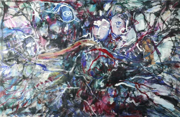 画中的人物和鬼魅、戏曲角色等纠缠在一起,一个人物的头倒转着,这样不和谐的牛鬼蛇神组合一如现在混杂不明的局势一样,这是一个大融合、大变革的时代,我们在混沌不明中感受到这样恐慌的情绪。他的绘画是这样的情绪,他画的关于新冠病毒的题材也是这样一种危险来临的气息。