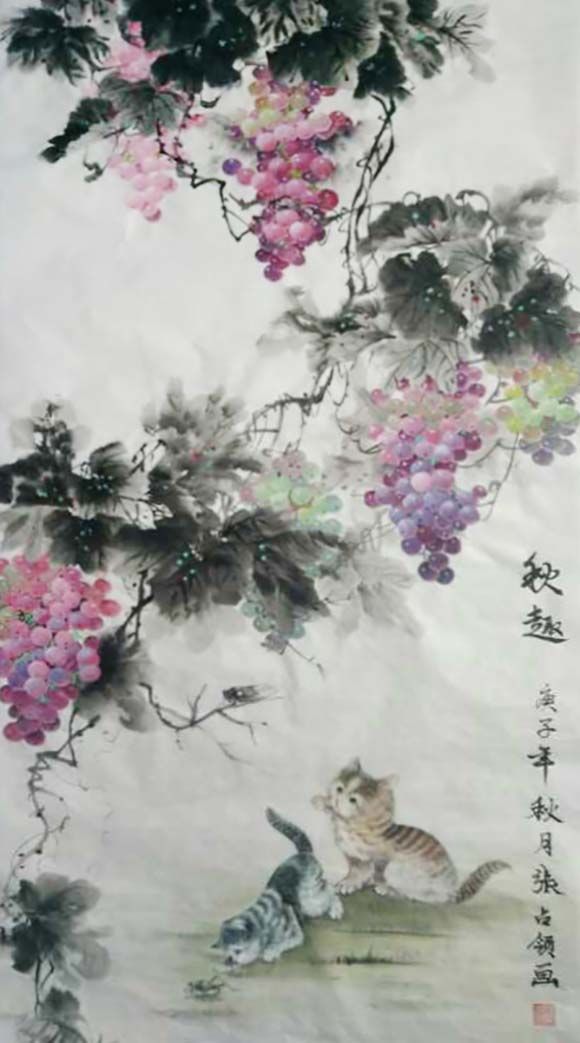 然后他的葡萄珠画法,却显得与古法有不同的视觉感受,是介入了西洋画的造型特征,对葡萄珠粒的形态塑造进行了常精确的透视表现和光影表现,珠珠如玉,紫气东来,把枝叶藤蔓的写意与葡萄珠粒的超写实姿态相互衬托,营造出虚实相接,有无相生的哲学境界。让葡萄画既有意象的美妙,又有形象的悦目,无论在艺术性和观赏性上都是此峰高于彼峰的新格局。从这个角度来讲,他让徐渭的葡萄画穿越了600年的潜行,重新显观于文化复兴背景下的新奇观,不恨今人不识我,唯恨古人不见我,借古开今,独领风骚,让前辈的葡萄作品成为此题的王者尊贵。郑板桥以竹画而闻名天下。齐白石以虾画而四海有功,张占领先生的葡萄图同样可以走进千家万户饰屏障,人人尽知铸功名。
