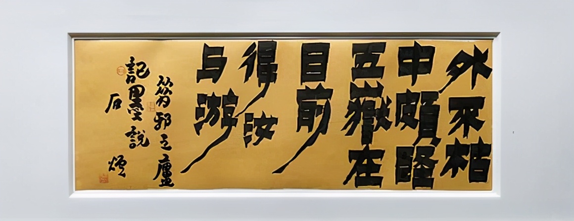 关于立意,如何拟金农书法的笔意,直指初心,拈花微笑,以意相会?石炉的书法,在线条、方角、形格上进行模拟,漆书笔笔到位,雕版书法以刀为笔,皆能力追金农笔意,充分把毛笔的锥形笔尖的点、切、拦、截的运笔充分体现,达到只有完形,才言神似!
