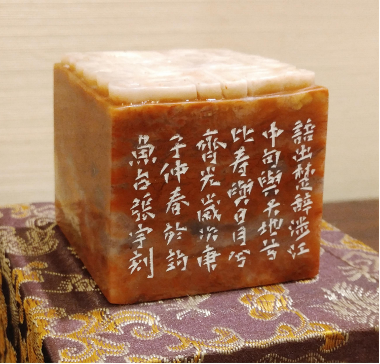 张宇先生为首都博物馆创作的篆刻作品《与日月兮齐光》印,选用中国福建产的寿山石,尺寸5.5厘米正方,上雕具中国吉祥意义的“祥云龙纹”图案。篆刻的内容及载体,都是从以祝福祖国,表达和平进步,和谐发展,合作共赢,并致敬时代英雄为初衷。