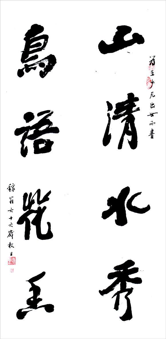 自从退休后,时间充裕,生活悠闲,更加醉心书法,苦攻篆隶。多年储备的人生经历和文学修养和对中国传统文化的全面认知都在其退休后的书法创作中得到全面爆发。其书法能秉承二王,兼容颜柳,并以魏碑入笔法,以行草出其形,得何绍基形质,有康有为之神韵,极具文人书法之内涵和雅韵,被当地众多书家和学者所推崇。
